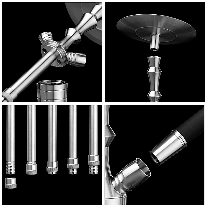 Downstem (spodní trubka) je vybaven nastavitelným difusorem, který umožňuje zjemnit tah a výrazně ztišit bublání. Můžete si tak zvolit, zda chcete lehký tichý potah, nebo otevřenější tah s větší produkcí dýmu. Nerezové části jsou snadno omyvatelné a odolné vůči korozi, spoj těla s vázou je řešen šroubovacím závitem pro jisté utěsnění i bezproblémové vyfukování kouře přes zpětný ventil.